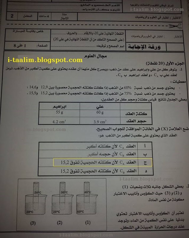 عناصر الاجابة لمادة العلوم للسلك الابتدائي
